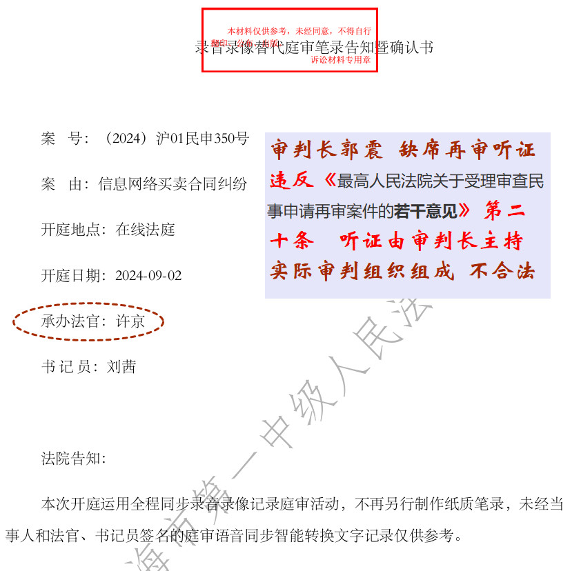 2)【违法事实】听证实际主持人许京(非审判长),并且只有一人,缺席2人(郭震、魏海虹)。审判长郭震缺席再审听证,许京没有资格主持听证。
