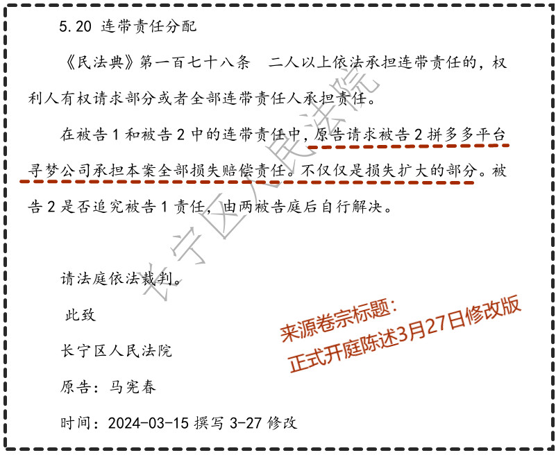 当初立案时对法律的认识相当粗浅(现在水平有所提高),只知道承诺就要赔偿,起诉时也仅利用了《最高人民法院关于审理网络消费纠纷案件适用法律若干问题的规定(一)》(2022年3月15日起施行),“第十条平台内经营者销售商品或者提供服务损害消费者合法权益,其向消费者承诺的赔偿标准高于相关法定赔偿标准,消费者主张平台内经营者按照承诺赔偿的,人民法院应依法予以支持”。因此在宁波起诉时只有一个核心诉请——判决被告继续履行此次买卖合同的赔偿部分,向原告赔偿合同承诺的假货赔偿金 1800 万元”(每套200万三倍,三套,直播间售货视频证据已在网,后来更正为100万三倍共900万)。 (上图为宁波移送上海长宁法院时的起诉状,在上海一审卷宗可查) 本案2023年8月1日在宁波立案,后因拼多多提出管辖异议移送上海长宁法院(其实,长宁法院属非法接受移送,有最高法判例,另文论述)。我当时挺开心的,一是上海大城市,法官水平高;二是时间推迟会超过被告撤销合同的时限(《民法典》第152条 有下列情形之一的,撤销权消灭:(一)…重大误解的当事人自知道或者应当知道撤销事由之日起九十日内没有行使撤销权);三是我可以更多收集证据和学习法律。后来的发展证明,这些时间赐予我很多好处(包括查本文案例、国家颁布新的法释(2023年12月5日施行的《最高人民法院关于适用〈中华人民共和国民法典〉合同编通则若干问题的解释》——能够化解本案四个难题:通常含义“假一赔三”理解的否定、可得利益“差值”计算、恶意违约金“不减”、交易习惯举证责任分配)。 回归正题,正是这段时间,我在中国裁判文书网查到了“(2018)苏13民终2202号《佛山聚阳新能源有限公司与邬*…买卖合同纠纷二审民事判决书》”,并知道这是最高法优秀案例——《最高人民法院办公厅关于全国法院系统2020年度优秀案例分析评选结果》法办〔2020〕394号二等奖文书——“50.邬*诉佛山聚阳新能源有限公司买卖合同纠纷案——真意保留的法律适用规则”(朱庚等)(江苏省一等奖)。后来作为【法证1】提交到上海长宁法院(一审卷宗有存)——作为本案重点类案证据,但被邓鑫法官否定(否定理由是两案案情并非完全“一致”,邓鑫违背法律标准“相似”性——《最高人民法院关于统一法律适用加强类案检索的指导意见》六、承办法官应当将待决案件与检索结果进行相似性识别和比对,确定是否属于类案)。再后来直到现在,(2018)苏13民终2202号在中国裁判文书网消失不见。 这篇文书到底说了啥?谁有能量把它雪藏? 先简单描述一下案情:商家价值万元热水器网络标价1元售卖,邬*先后4次下单购买20台,商家不发货。一审法院判决按商品市场价值赔偿邬某22万元。 本文引述二审裁判文书核心观点: “邬*作为网络交易的购买方,在其首次购买4台空气能热水器时,不宜认定其主观上非善意,即明知聚阳公司的标价系虚伪意思表示。理由为: 第一,网络交易具有特殊性,其具有迅捷、非面对面、针对不特定群体、信息不对称等特点,维护交易安全应为其首选价值取向,购买方在遵守网络交易规则的前提下进行的购买行为的信赖利益应当得到保护。 第二,聚阳公司作为网络交易的经营者,应秉持更加审慎、诚信的原则,应对其发布的产品要约信息负责,其自导自演刷单行为显然违背了市场交易诚实信用原则,应当承担相应的法律后果。 第三,现无证据证明邬*此前存在利用网络商户虚假标注或因疏忽错标商品价格而进行相关交易,借此向对方索赔以谋取利益的行为。 至于邬*购买商品系用于自用或经营,还是转售给他人,对判断其是否为 善意相对人并无实质影响。 因此,虽然聚阳公司将空气能热水器标价为1元的确存在不合理之处,但并不能够当然确定邬*在发起首笔交易时明知聚阳公司的1元标价系虚伪表示。在双方首次交易中,邬*对于聚阳公司订立合同的意思存在合理信赖,应以聚阳公司的意思表示为准,认定双方订立的买卖合同成立并生效。 如此处理也有利于规制网络刷单行为,引导网络商户诚信经营,净化网络购物环境,维护网络交易安全和网络交易秩序。” 最后,“因聚阳公司违约导致邬斌不能取得其所购4台规格5p空气能热水器,则该4台规格5p空气能热水器的实际价值即为邬斌基于合同履行后能够获得的履行利益,4台规格5p空气能热水器的市场价格即为邬斌的实际损失,聚阳公司应按此数额予以赔偿。一审法院参照规格5p空气能热水器的市场价格,酌定按每台9000元的标准计算邬斌的损失并无不当。据此,邬斌在第一份合同中的损失数额为36000元,聚阳公司应予赔偿。关于双方在后形成的三份订单,因合同未成立,聚阳公司应向邬斌返还其已付货款16元和运费1元。除此之外邬斌并无其他损失,无权要求聚阳公司赔偿。邬斌要求聚阳公司按照四份合同中的全部标的物即20台空气能热水器的市场价值赔偿其损失,于法无据,不应支持。” 这是“类案核心价值观”,是最高法的价值导向。 在《最高人民法院办公厅关于全国法院系统2020年度优秀案例分析评选结果的通报》中指出,“为确保评审水平和质量,我院组织30余位资深法官和法学教授组成10个专家评审工作组,制定严格的评审程序和评审标准,实行一稿三评、独立评审、同行评审,对各单位推荐符合评审条件的2627篇参评案例进行了认真评审。同时,为